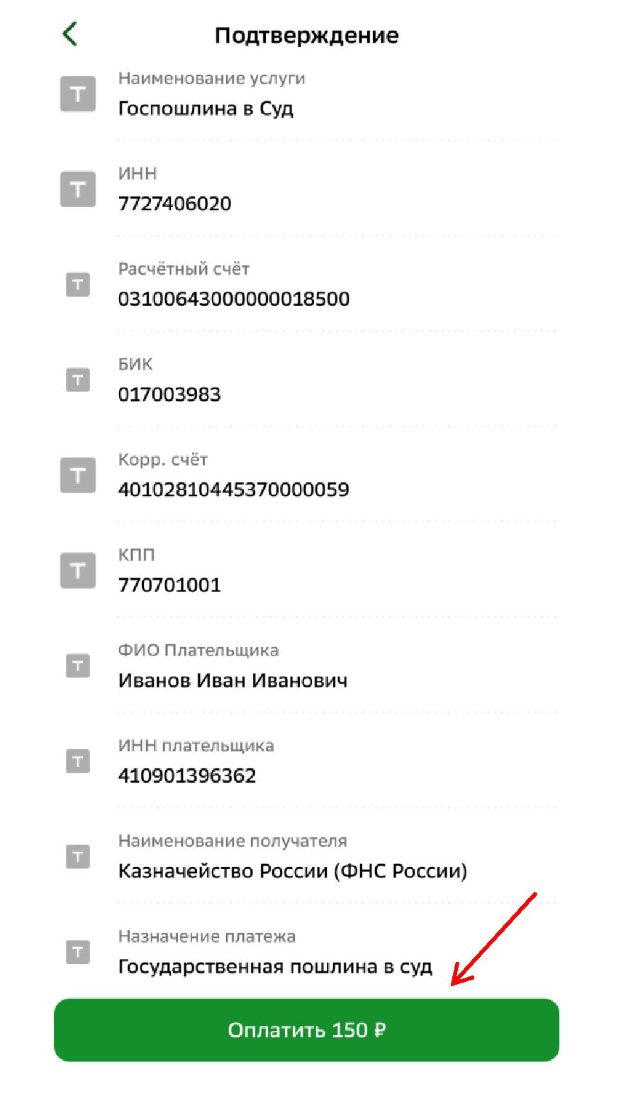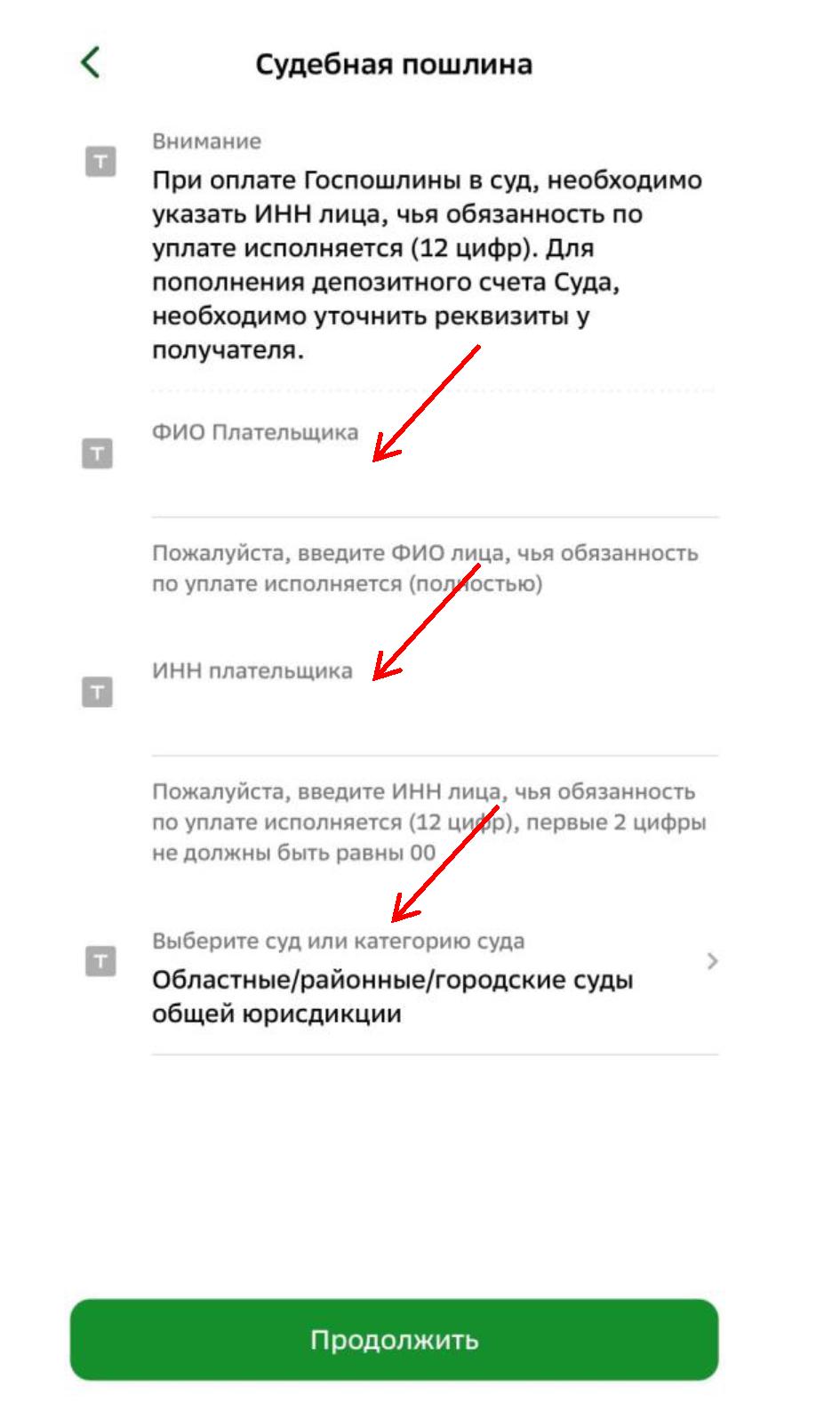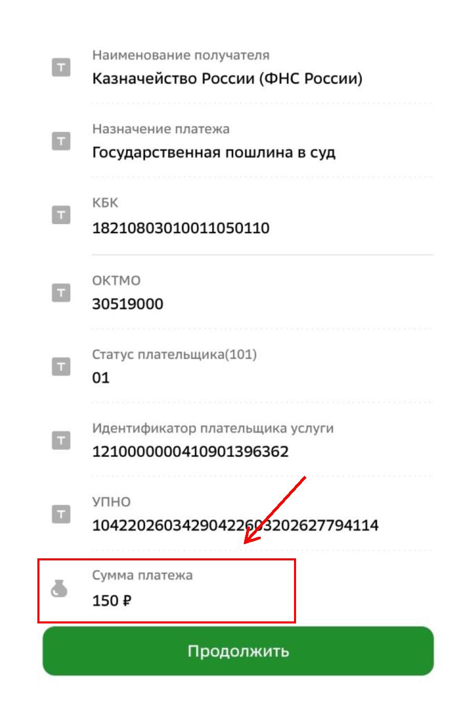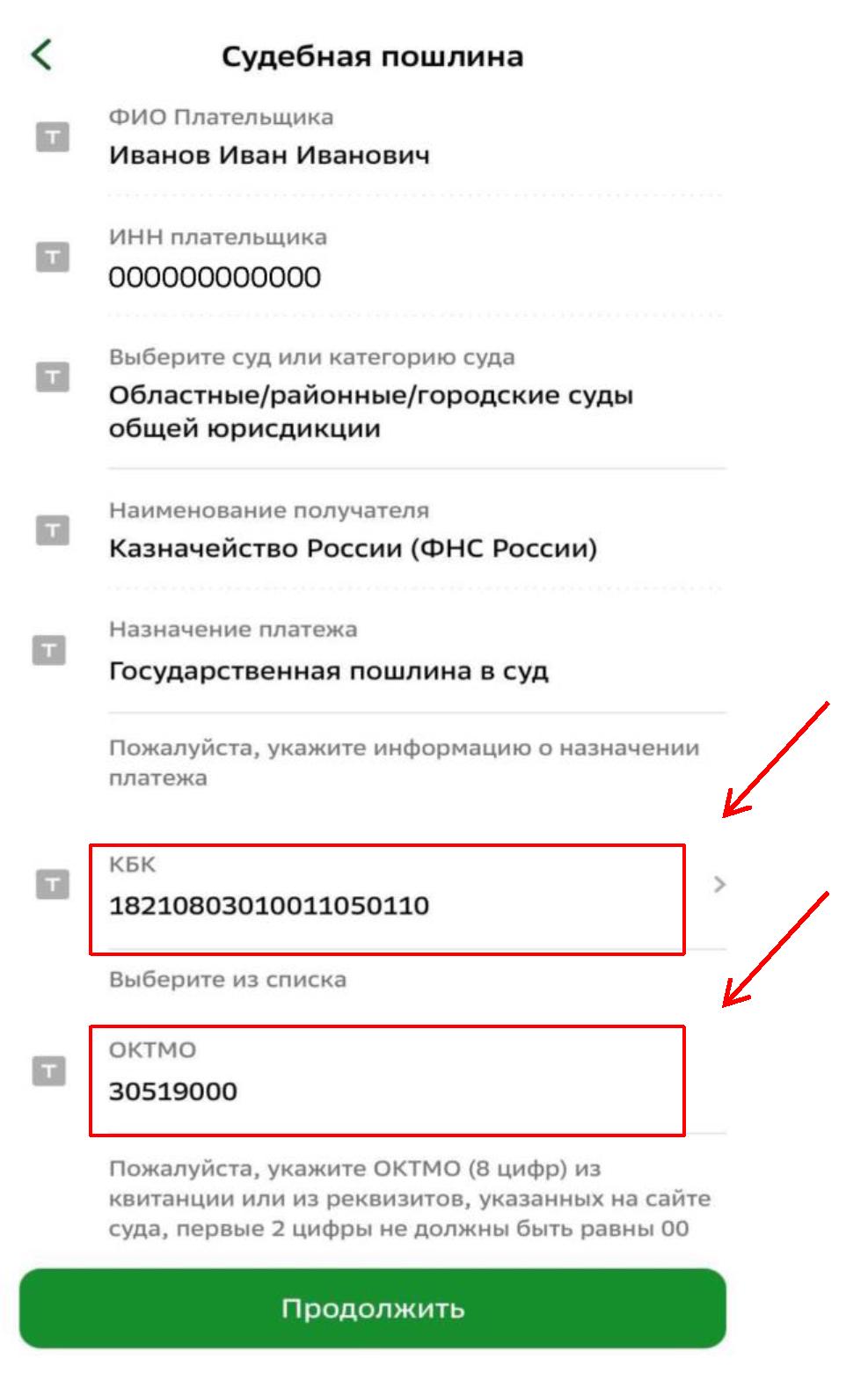 6. Далее укажите КБК и ОКТМО из квитанции или реквизитов, указанных на сайте суда.